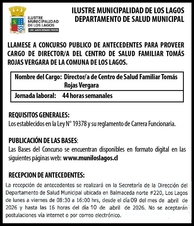 Llamados a concursos y convocatoriasMunicipalidad de Los Lagos, Llámase a Concurso Público de antecedentes para proveer cargo de Director/a del Centro de Salud Familiar Tomás Rojas Vergara de la comuna de Los Lagos6 de Marzo de 20266 de Marzo de 2026Por Publilegales