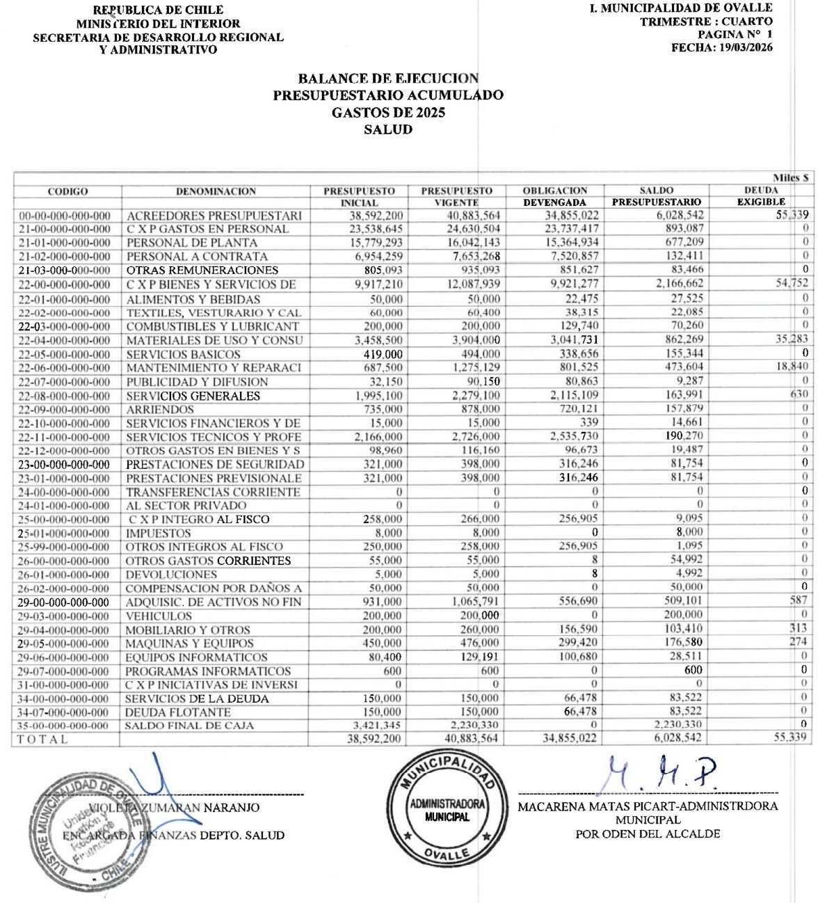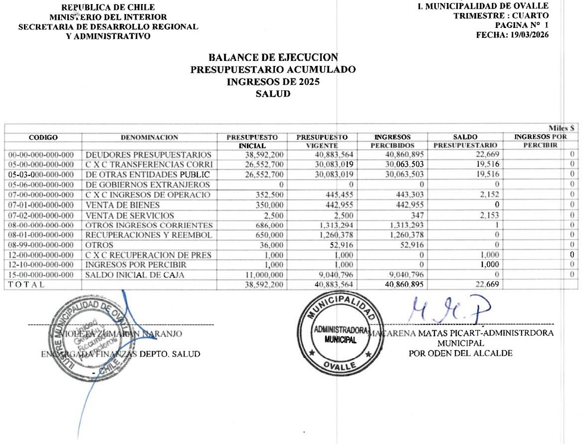 Municipalidad de Ovalle, Departamento de Salud, Balance de Ejecución Presupuestario Acumulado, Ingresos de 2025; Gastos de 2025