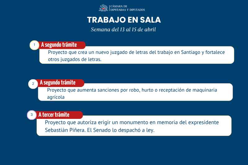 También se derivó a segundo trámite la iniciativa (boletín 17880) que fortalece la justicia laboral, a través de la creación de un nuevo juzgado de letras, en Santiago. Además, se refuerza el número de jueces de los tribunales de Antofagasta, Punta Arenas y Concepción. Junto a esto, se aumenta el personal administrativo de estos juzgados.