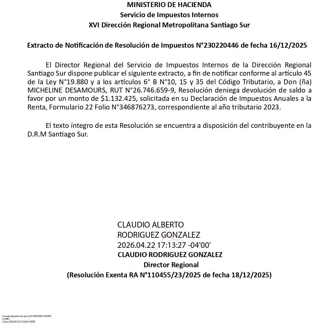 Servicio de Impuestos Internos XVI Dirección Regional Metropolitana Santiago Sur, Extracto de Notificación de Resolución de Impuestos N°230220446 de fecha 16/12/2025
